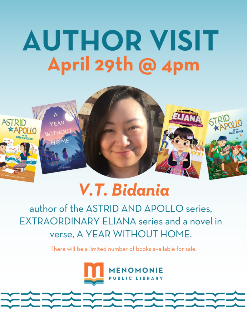 V.T. Bidania will be at the Library on April 29th from 4-5pm. She was born in Laos and grew up in St. Paul, Minnesota. She is the author of many children’s books, early readers and middle grade books starring Hmong American characters.