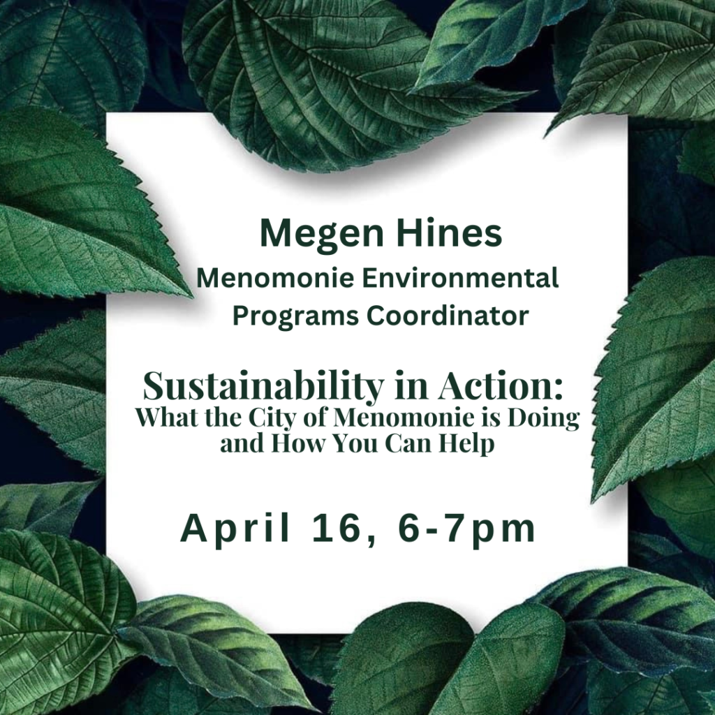 Join Megen Hines, Environmental Program Coordinator for the City of Menomonie, for an overview of the City’s environmental work, from recycling and waste reduction to stormwater protection, urban forestry, sustainability initiatives, and energy efficiency. The second half of the talk will highlight practical, everyday actions residents can take to reduce waste, conserve resources, and help keep Menomonie healthy and resilient for years to come.
