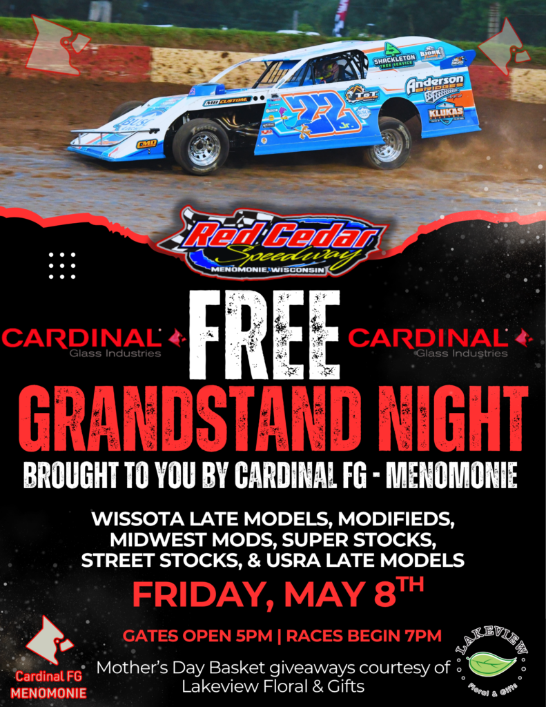 Come on out to the Red Cedar Speedway for FREE grandstand night courtesy of Cardinal Glass Industries of Menomonie.