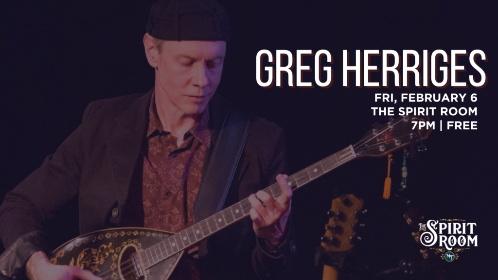 FREE IN THE SPIRIT ROOM: Greg Herriges stirs a mix of original and traditional “progressive world music” on guitar, voice, and Greek bouzouki, with a unique approach honed by his studies of Asian, Mediterranean, and other worldly styles. An award-winning composer and performer, his music and writing have found international recognition. His solo & duo sets include lively instrumentals, inventive versions of rock and jazz standards, and mesmerizing world music.