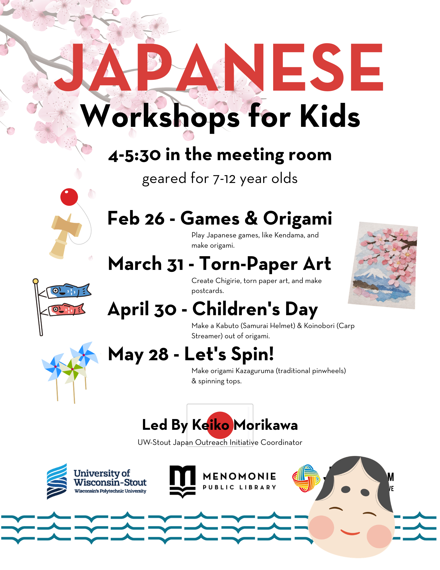 Keiko Morikawa, UW-Stout Japan Outreach Initiative Coordinator, will lead 4 hands-on classes highlighting Japanese traditions and crafts. The classes are for kids ages 7-12 years old and will be from […]