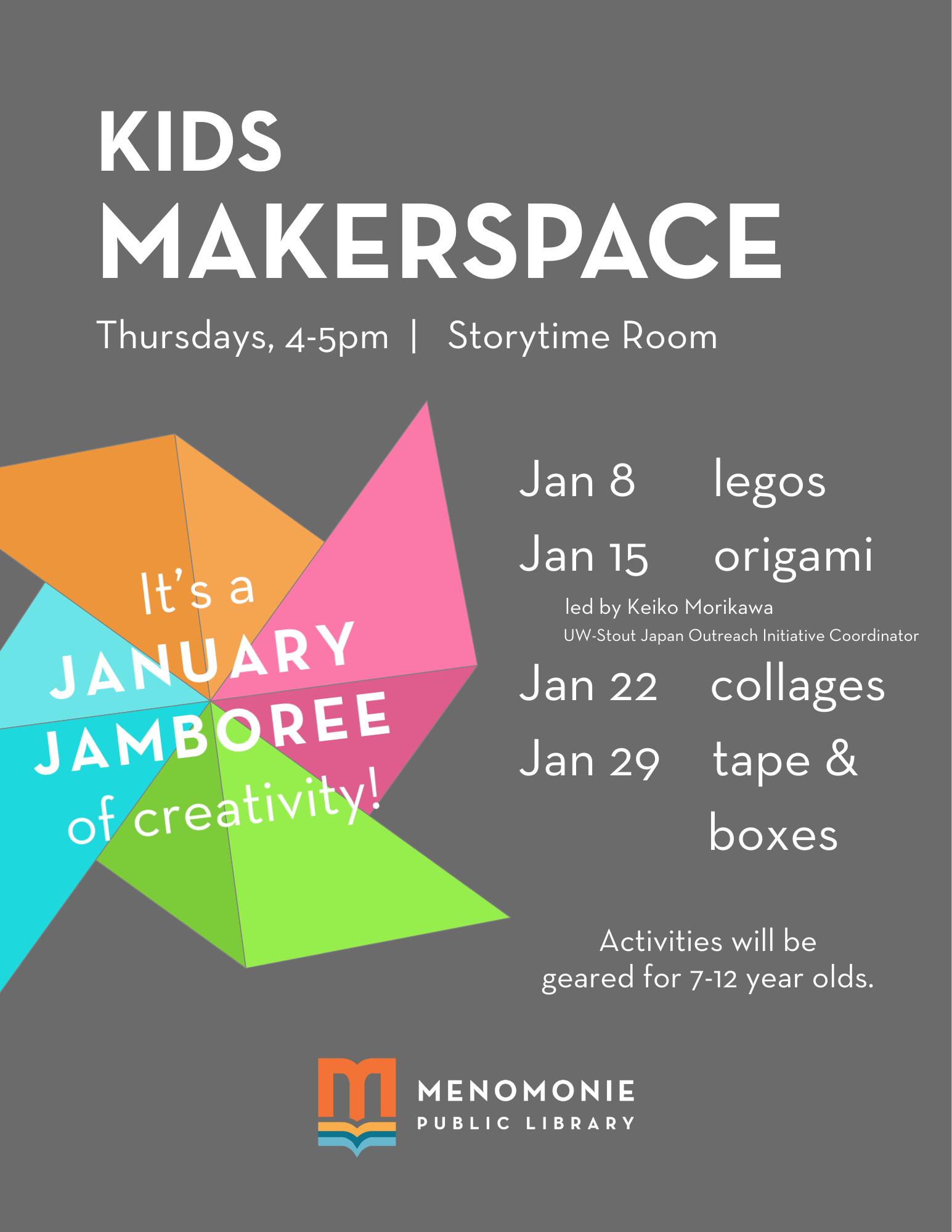 It's a January Jamboree of creativity at the library! Kids ages 7-12 will delight in 4 different maker activities on these Thursdays from 4-5pm: Jan 8 legos Jan 15 origami […]